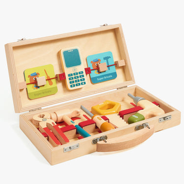 Fix, saw, hammer and drill! This wooden toolbox lets kids practise using five tools with cards showing what to repair.