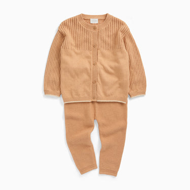 Keep little ones cosy and coordinated with our Pointelle Tan Knitted Cardigan & Leggings Outfit. This two-piece outfit includes a beautifully detailed cardigan with contrast trim and soft knitted leggings, both crafted from a warm organic cotton blend.